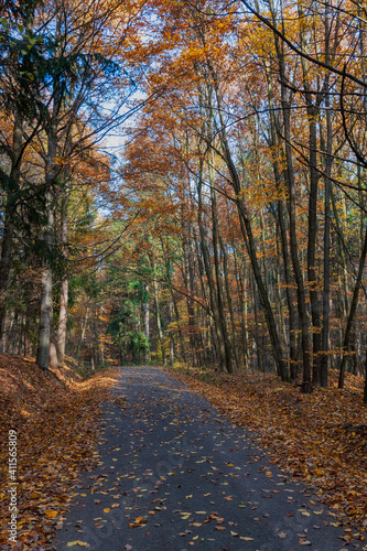 © Jana Krizova, Obraz premium Forest road leading through a tall deciduous forest. Fallen autumn leaves are on the way.