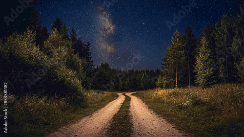 © ppalgangong, Obraz premium Forest road under starry night sky