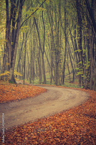 Obraz premium Forest road with beech trees on early autumn day
