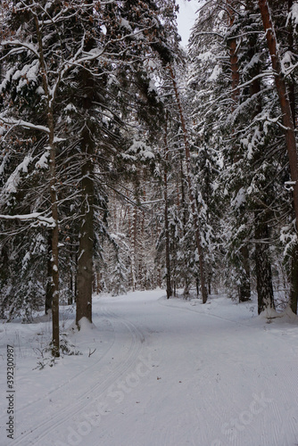 © Natalia, Fototapeta premium forest road with ski tracks in the winter forest, Russian nature, winter landscape