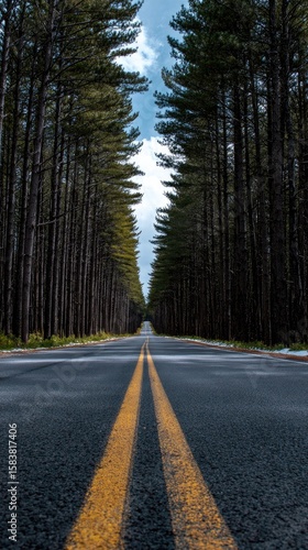 © BaniMakrufah, Fototapeta premium Forest road, yellow lines, straight ahead