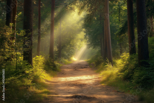© Paulina, Naklejka premium forest sand road in beautiful green forest in summer, generative AI