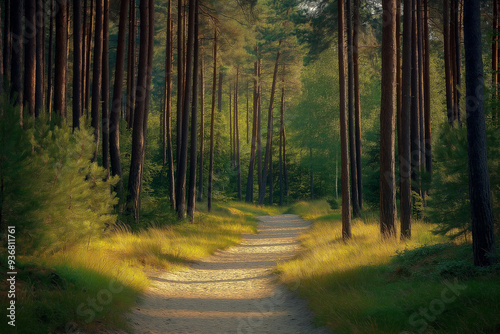 © Paulina, Fototapeta premium forest sand road in beautiful green forest in summer, generative AI