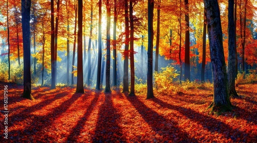 © indi, Obraz premium Forest scene bathed in warm sunlight, trees with autumn colors, shadows cast on the ground