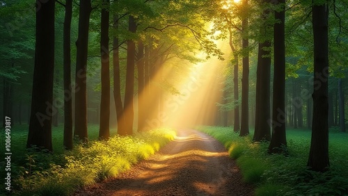 © CoveRipple, Obraz premium Forest scene dawn_dusk dirt path trees light