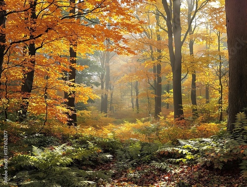 © Arnonwat, Obraz premium Forest scene in soft focus with autumnal trees and undergrowth, muted colors, forest atmosphere