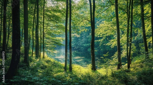 © akhmad, Fototapeta premium Forest Scene With Lake