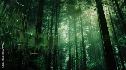 Naklejka premium forest scene with stock chart close up, focus on, copy space, lush green...