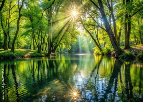 © Songkran, Fototapeta premium forest scene with sunlight filtering through trees