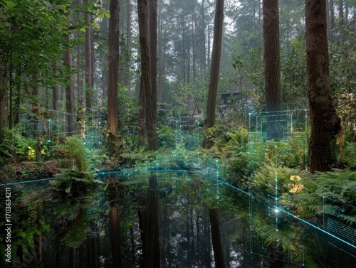 Obraz premium Forest scene with water reflecting tall trees and digital overlays
