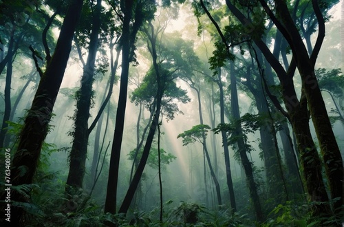 Fototapeta premium Forest Serenity: Sunlight Filtering Through Dense Trees