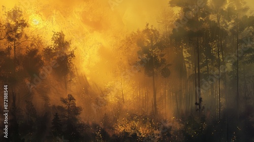 Naklejka premium Forest shrouded in morning mist, sunrise casting a golden glow, atmospheric and quiet