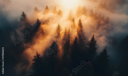 Naklejka premium Forest silhouettes, misty sunrise, golden sunbeams, pine trees, foggy atmosphere, dramatic lighting, ethereal landscape, moody sky, dreamy nature scene, cinematic composition, warm color palette