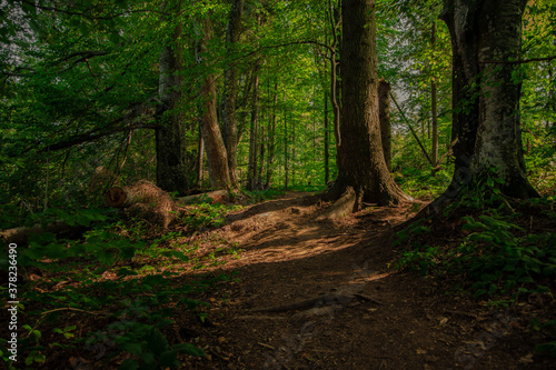 © Artem Kniaz, Naklejka premium forest soft focus nature scenic view bright green foliage and dirt trail between trees in summer day
