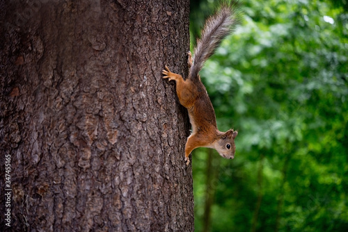 Fototapeta premium Forest squirrel on a tree in natural conditions