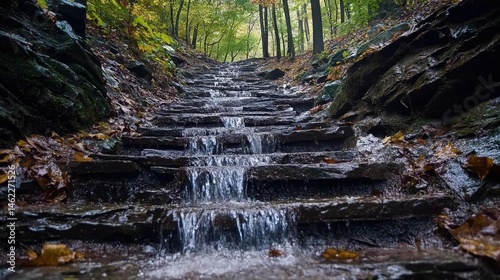 Fototapeta premium Forest Stairs with Flowing Water in Autumn, Rocks and Fallen Leaves Composition for Travel Blogging or Wallpaper Design