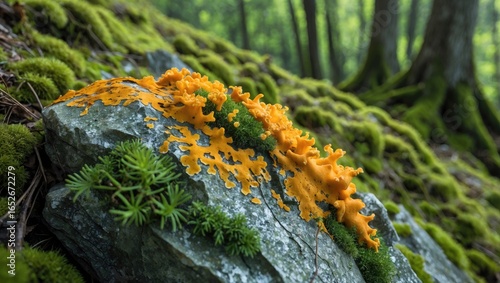 © DigitalDruid, Fototapeta premium Forest stone adorned with vibrant green moss and orange lichens, with lush foliage nearby