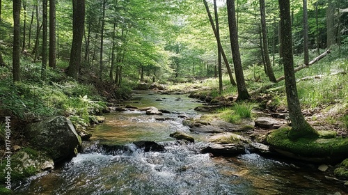 © jambulart, Fototapeta premium Forest stream flows over mossy rocks.