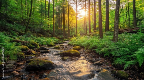© Art Sof galery photo, Obraz premium Forest stream flows, sun sets through trees.