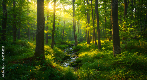 © Laodefardin, Obraz premium Forest Stream Sunlight