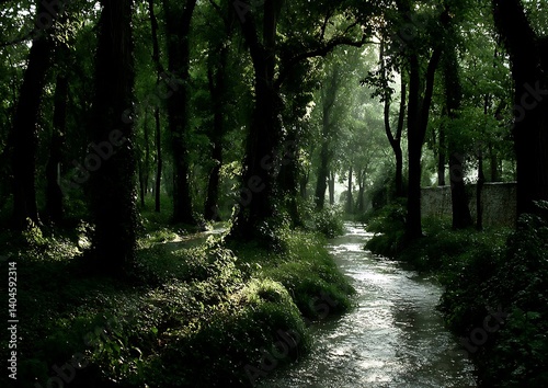 © Ratna, Obraz premium Forest Stream Sunlight Path.
