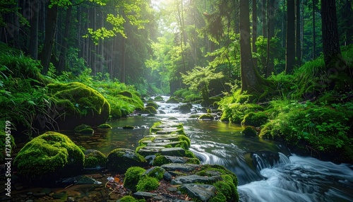 © Ghundutz, Obraz premium Forest stream with mossy rocks