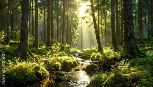 Obraz premium Forest stream with sun rays through trees.