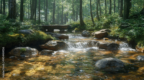 © Alleuy, Obraz premium Forest stream with wooden bridge
