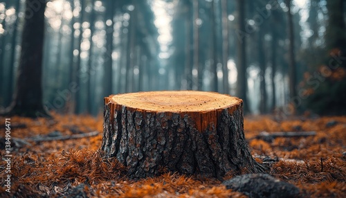 © GILANG A FEBRIYANTO, Obraz premium Forest Stump Serenity: A Tranquil Autumn Scene in the Woods