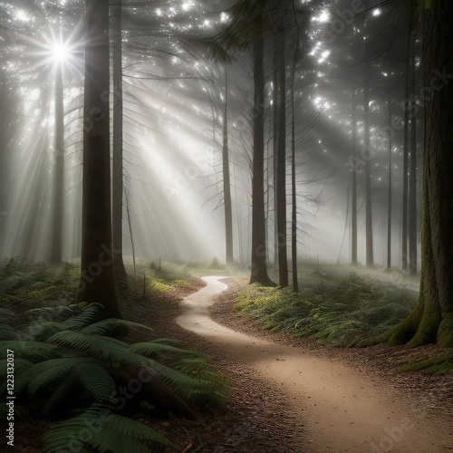 © Cameraman, Naklejka premium Forest, sun rays come through tree