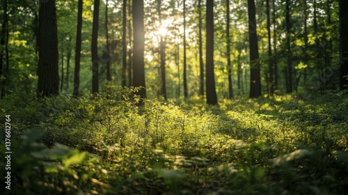 Fototapeta premium Forest Sunlight Filtering Through Trees Illuminating Green Undergrowth