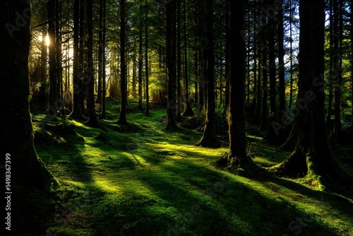 © Rayhan, Obraz premium Forest Sunlight Path Through Mossy Ground