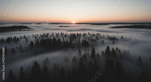 © Aufa, Obraz premium Forest Sunset Fog Aerial View
