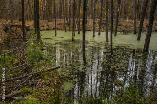 Fototapeta premium Forest swamp with trees and green water surface, autumn landscape background...