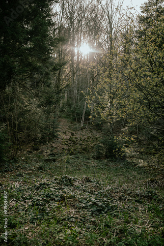 © Наталія Богодіца, Fototapeta premium forest thicket with pines, deciduous trees, moss, fairy-tale peace, sun, glare, various grasses, thickets, stones