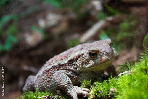 Obraz premium Forest toad with distinctive warty skin texture among vibrant green moss in...