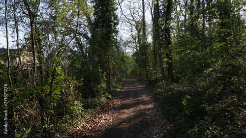 © Jakob, Fototapeta premium Forest track during spring in germany with green grass, trees and leaves.