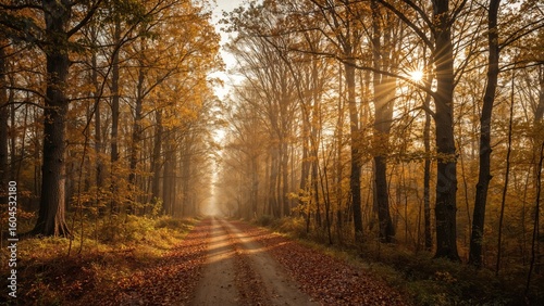 © TheWaterMeloonProjec, Obraz premium Forest trail bathed in crisp sunlight during fall, natural scenery, woods, landscape, illumination, woodland, autumn colors, greenery, parkland, trees