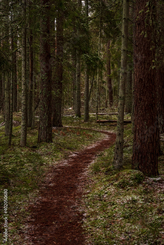 © gatis_photo, Obraz premium forest trail between trees in winter