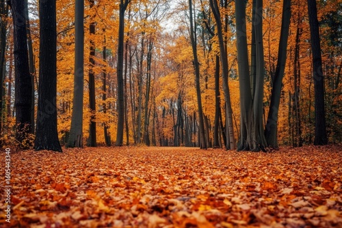 Obraz premium Forest trail covered in red and yellow fall leaves