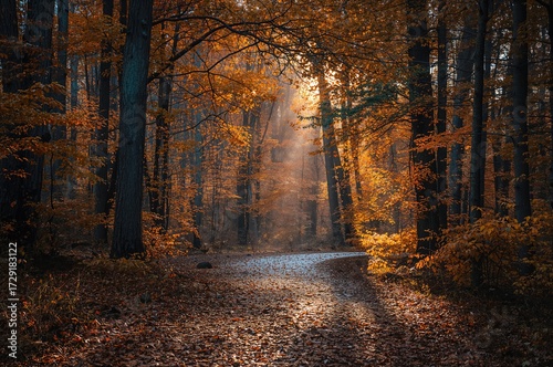 © The 2R Artificiality, Obraz premium Forest trail in fall illuminated by sunlight filtering through trees