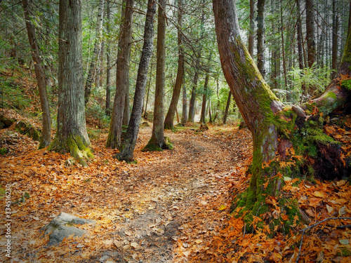 © Jasmin, Fototapeta premium Forest trail in Park of the Chute-à-Bull in autumn