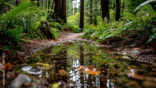 Obraz premium Forest trail puddle reflecting trees