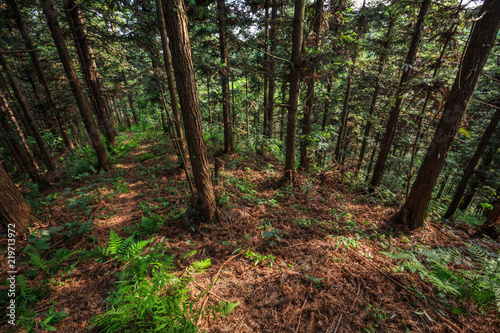 © Cedar, Fototapeta premium Forest Trail Scenic Area of Langshan - China National Geopark, Xinning County Hunan province. Danxia natural forest scenery, UNESCO Natural World Heritage site. Forest woods and trees, warm sunlight
