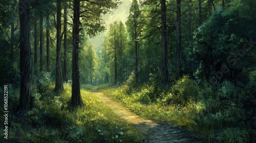Fototapeta premium Forest Trail Serenity, a tranquil pathway meandering through lush green...