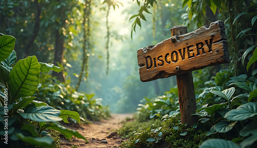 Fototapeta premium forest trail with a "Discovery" sign, framed by dense foliage and dappled...