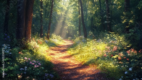 © Настя Шевчук, Obraz premium Forest trail with sunlight dappling the ground