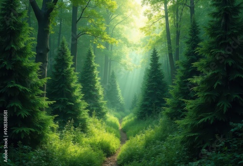 © khairun, Obraz premium Forest Trail with Sunlight Filtering Through Trees