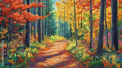 Obraz premium Forest trail with vibrant foliage