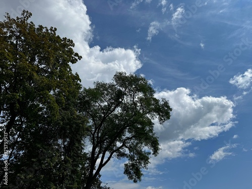 © OLENA LIALINA, Obraz premium Forest trees against sky clouds.